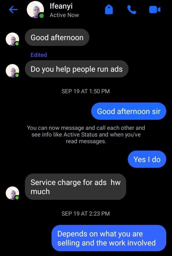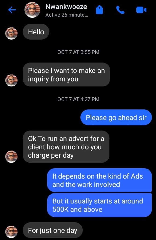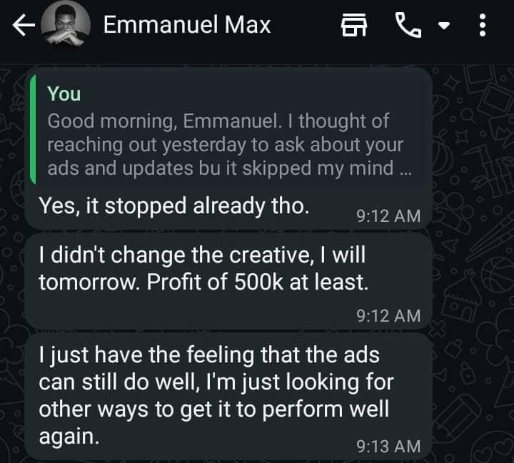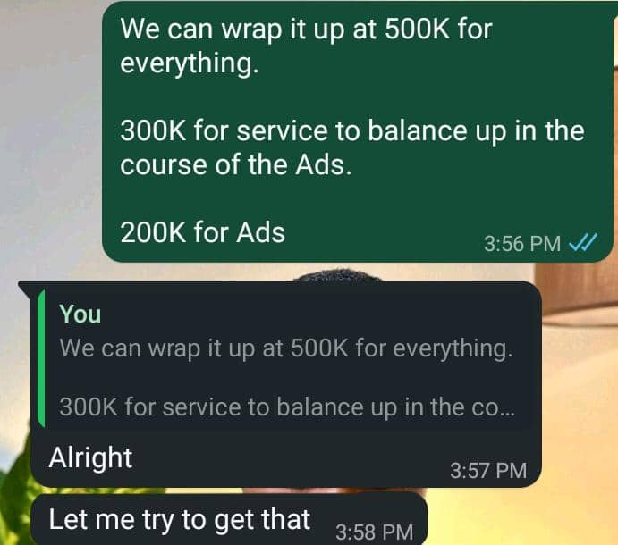 As you can see I was asking him to pay me 500K so I can help him run Ads